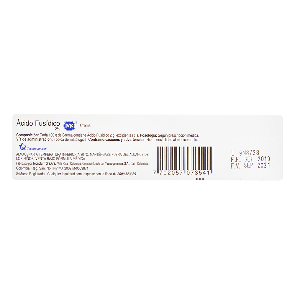 -El Ácido Fusídico 2% Crema Mk, es un agente antibacteriano de uso tópico indicado en infecciones de piel (abscesos, acné y celulitis) con actividad bacteriostática y bactericida, principalmente contra cocos Gram-positivos.