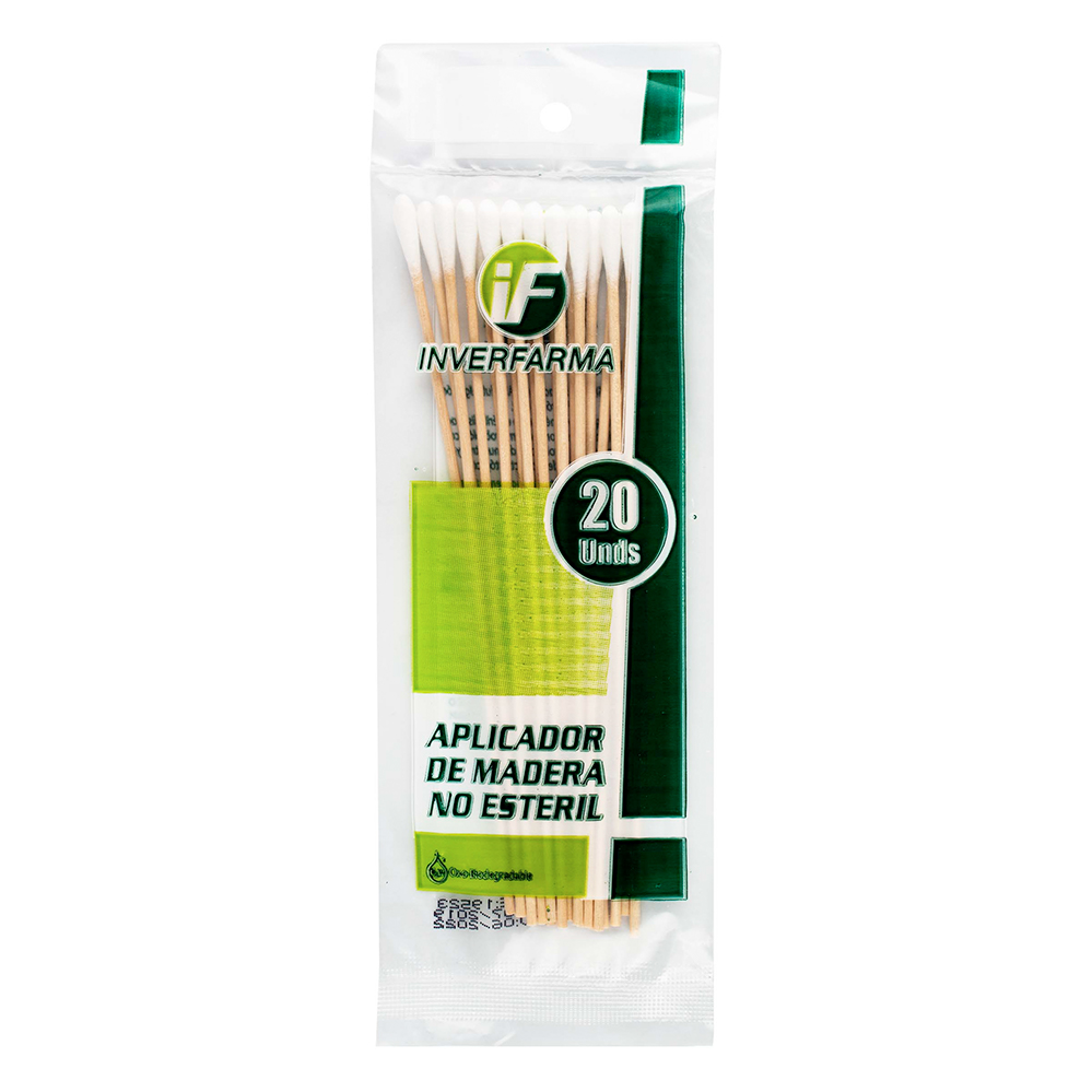 Aplicador de Madera Inverfarma 20 Unidades. No esteril. Diseñado para facilitar el monitoreo microbiológicoo superficies, recolección de muestras y la aplicación de productos tópicos. Mantener fuera del alcance de los niños. Manténgase fuera del alcance de los niños. Es un medicamento. No exceder su consumo. Leer indicaciones y contraidicaciones. Si los sintomas persisten, consultar al médico.