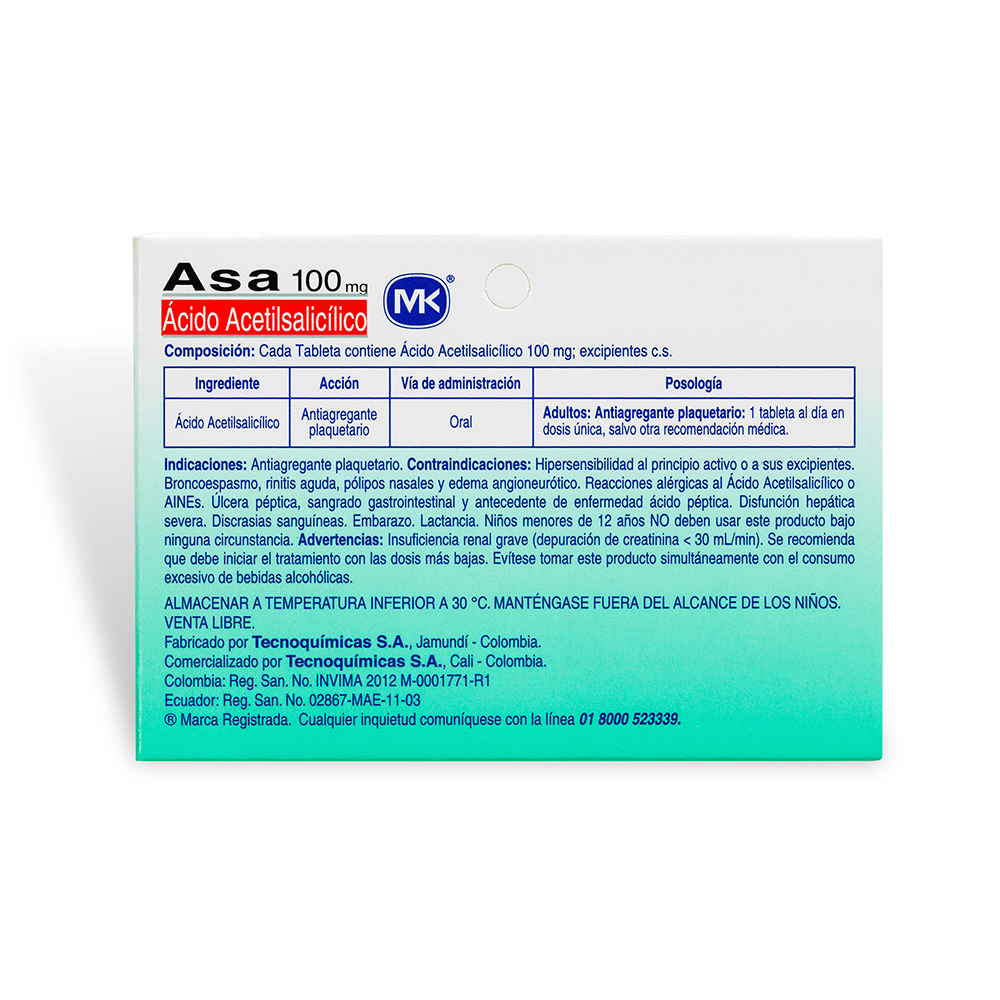 ASA 100 MG 100 TABLETAS MK le ayuda a prevenir la formación de coágulos de sangre en las arterias y también reduce el riesgo de tener un accidente cerebrovascular o un ataque cardíaco.
