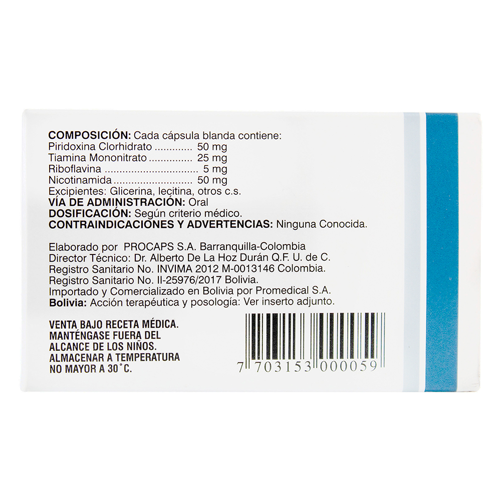 ada cápsula contiene: piridoxina clorhidrato 50 mg tiamina mononitrato 25 mg riboflavina 5 mg nicotinamida 50 mg