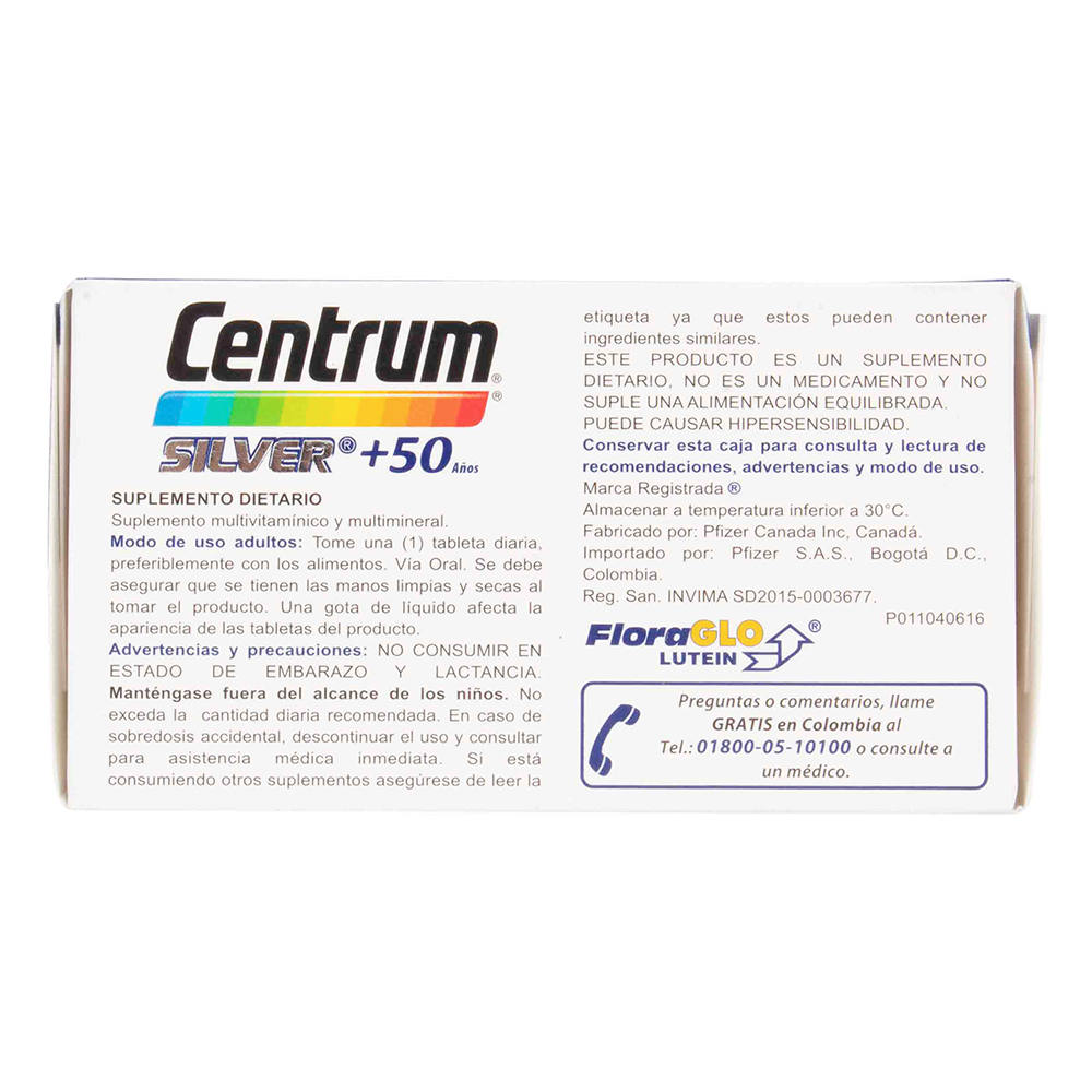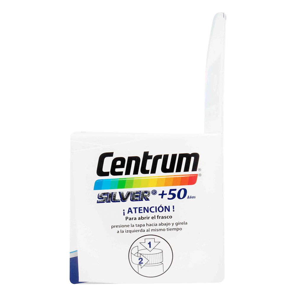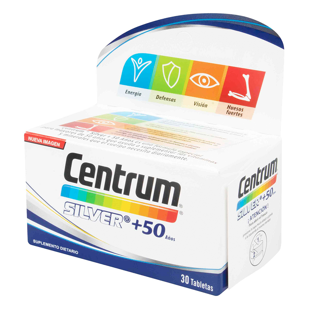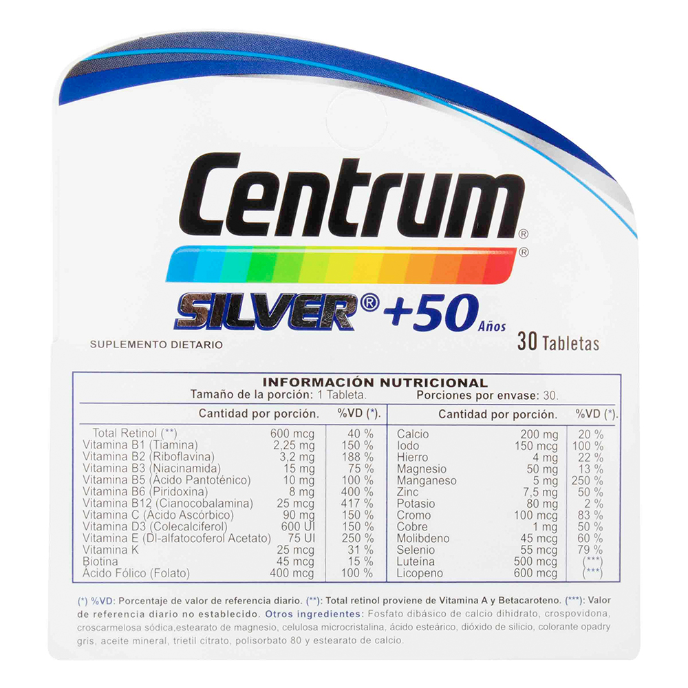 Centrum Silver + 50 años, Energía; La vitamina B2 (Riboflavina) es necesaria para la obtención de energía a partir de proteínas, grasas y carbohidratos. Defensas; Una ingesta adecuada de Zinc ayuda a fortalecer las defensas del organismo. Visión; La Vitamina A juega un papel fundamental en la visión, en el mantenimiento y regeneración de los huesos y dientes, en la reproducción y en el sistema inmunológico. Huesos Fuertes; El Calcio ayuda en el desarrollo de huesos y dientes fuertes. La Vitamina D ayuda al organismo a utilizar el Calcio y el Fósforo. X 60 tabletas