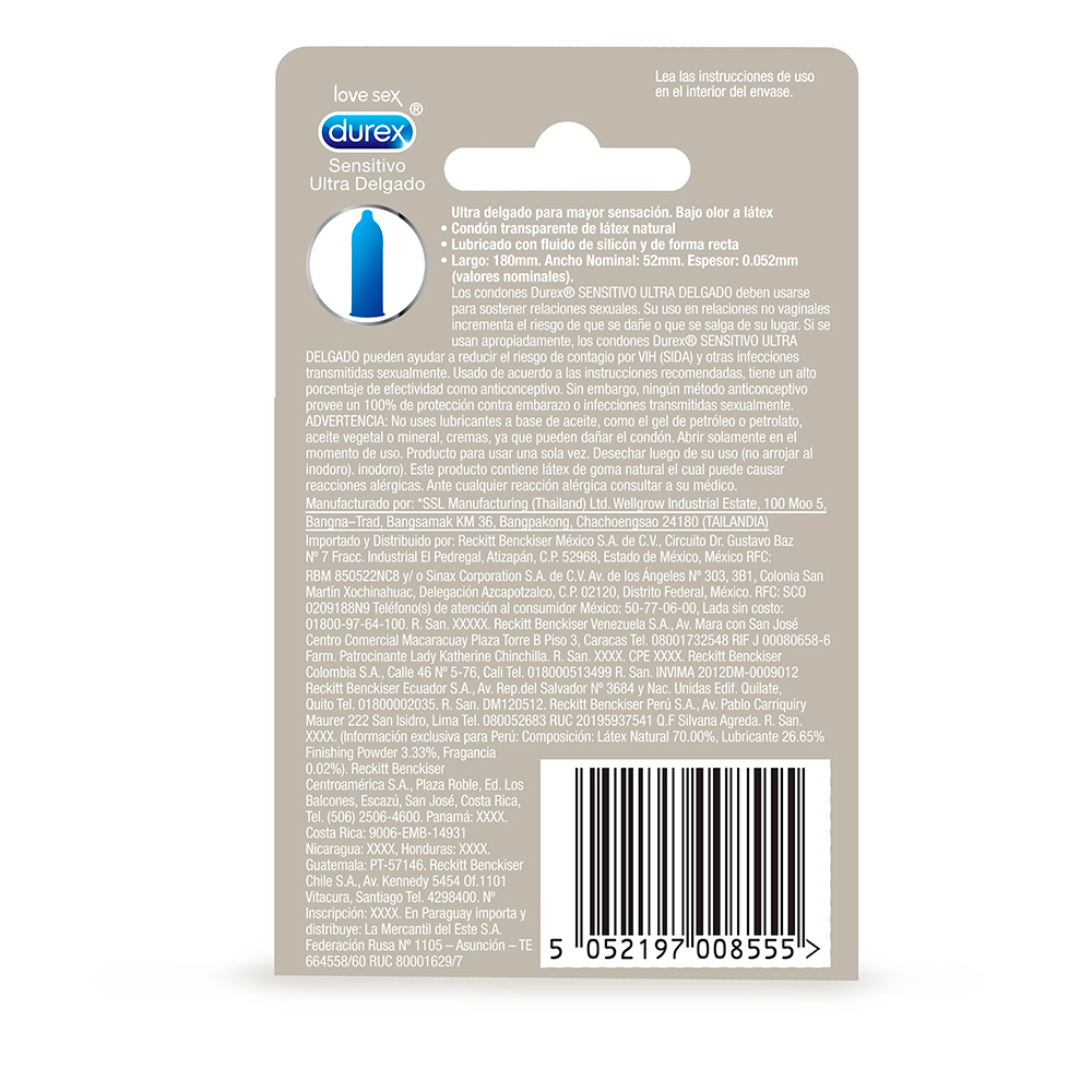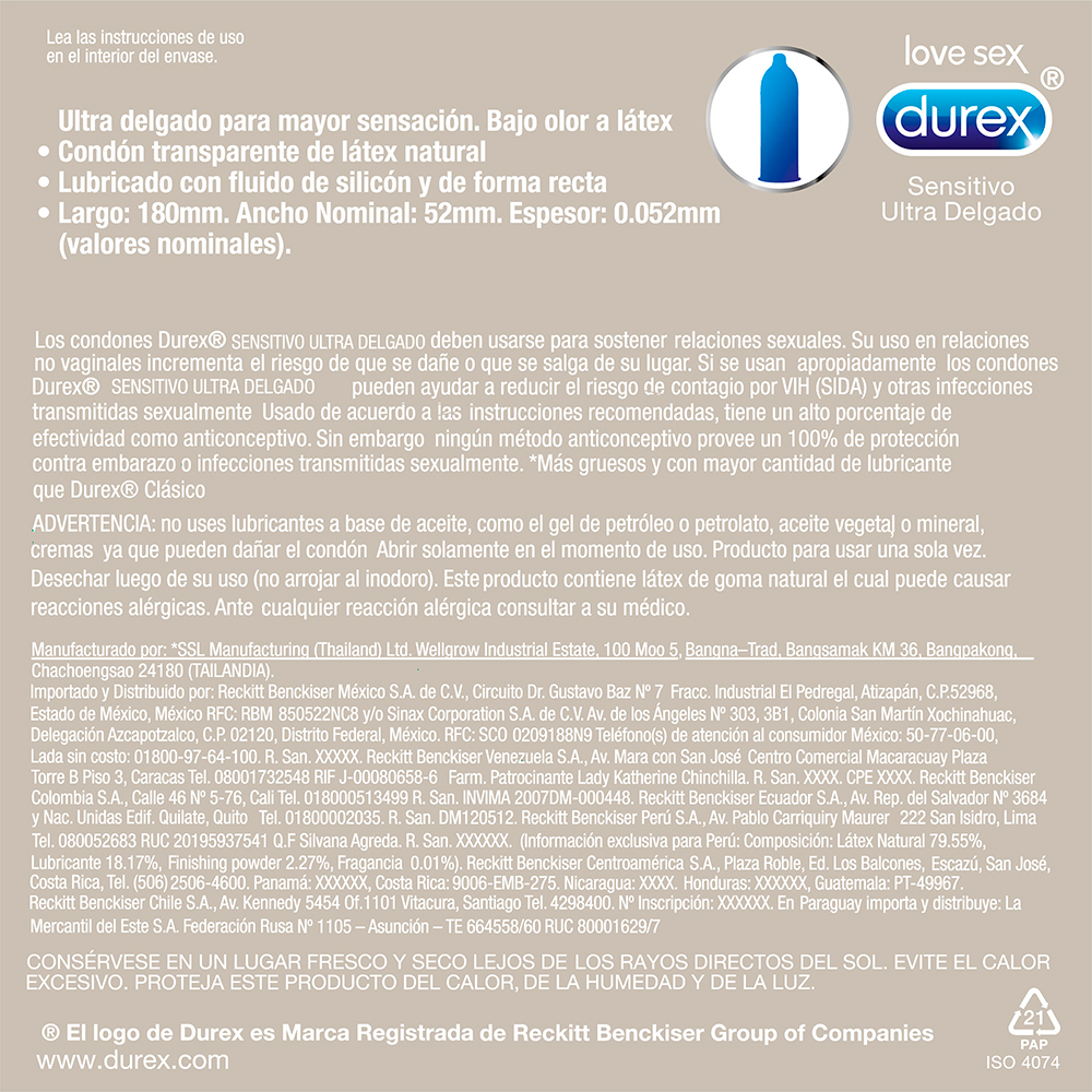 Condón delgado con forma recta fácil de poner y ajuste suave (18 cm), ancho nominal (regular 5.2 cm), preservativo con lubricante estándar y espesor ultra delgado.