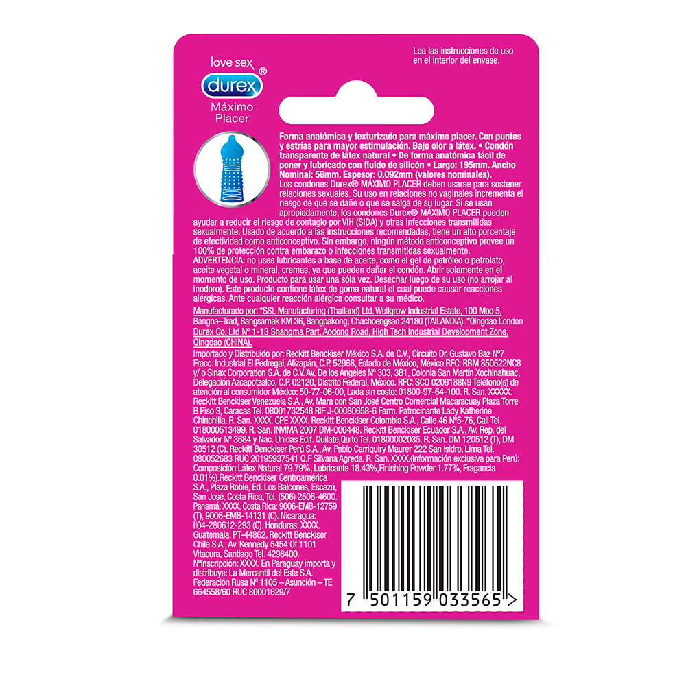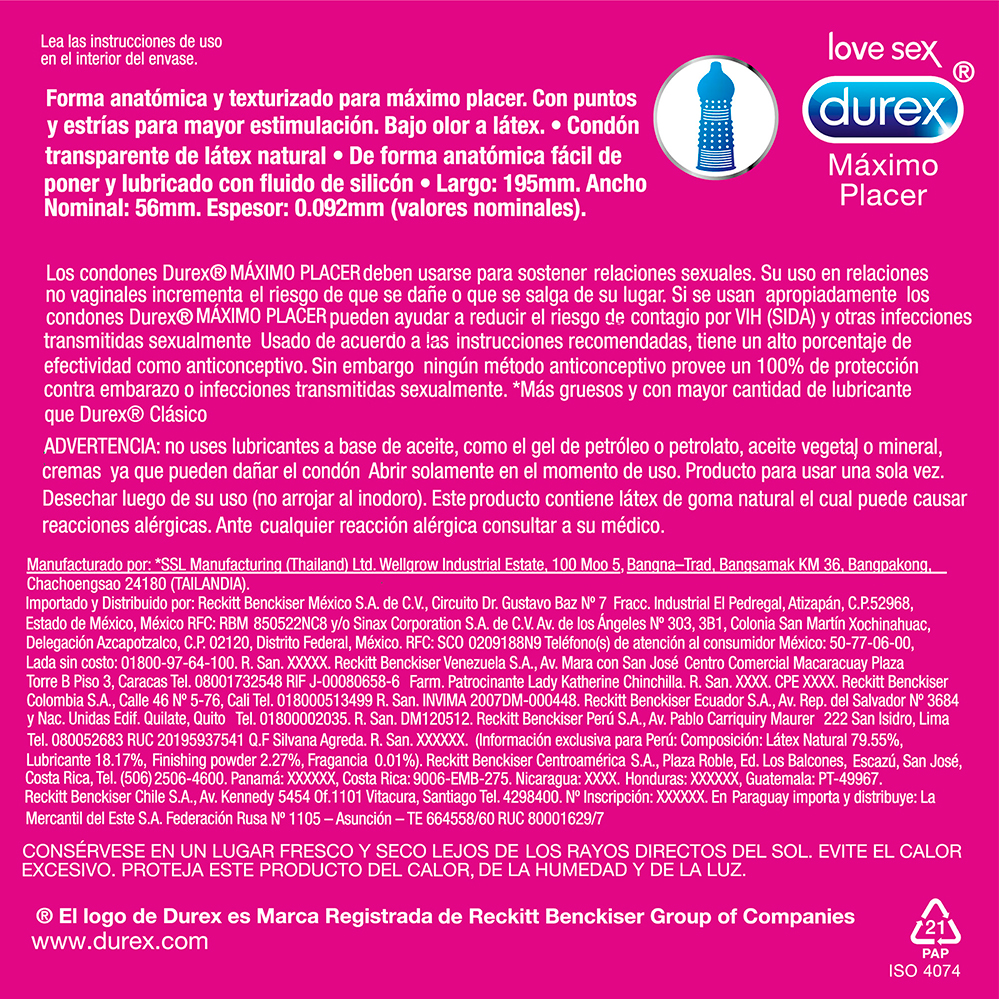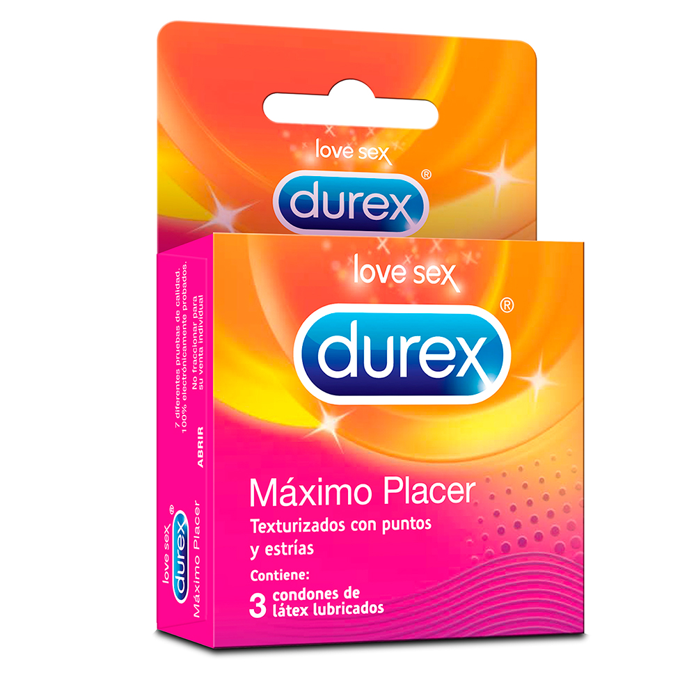 Condones Durex Máximo Placer con puntos y estrías con mayor estimulación para tu pareja.