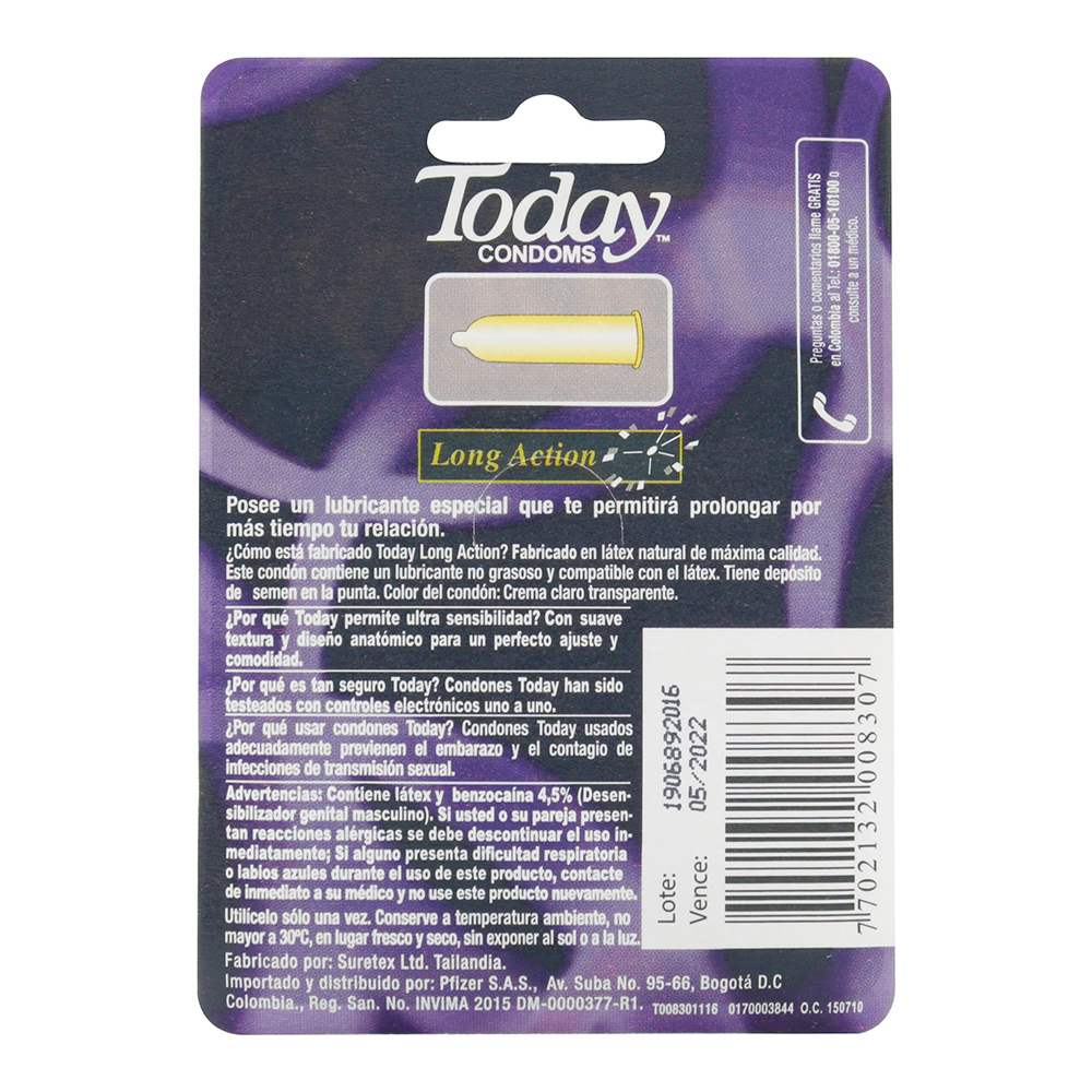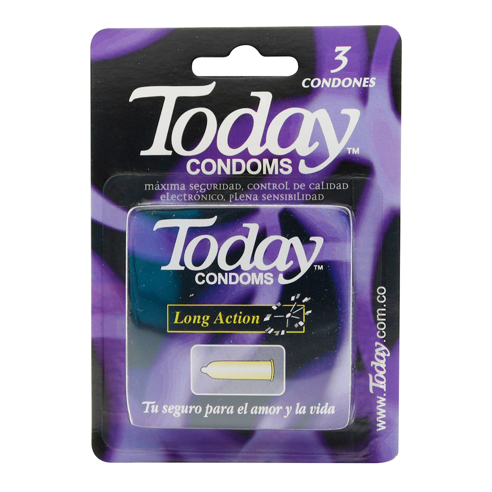 Today Condones Long Action, Retardante: Larga Duración, Posee un lubricante especial que te permitirá prolongar por más tiempo tu relación. Máxima calidad comprobada, seguridad, sensibilidad y control de calidad electrónico X 3 UND