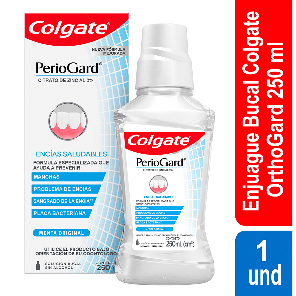 Usa el Enjuague Bucal Colgate OrthoGard para el cuidado y limpieza de tus dientes, recomendado por odontólogos. Obtén una sonrisa saludable y hermosa. Su envase de 250 ml es perfecto para llevarlo contigo a todas partes. Está hecho con una fórmula líquida que contiene fluoruro de sodio que ayuda en la prevención de las caries y la descalcificación de las piezas dentales.