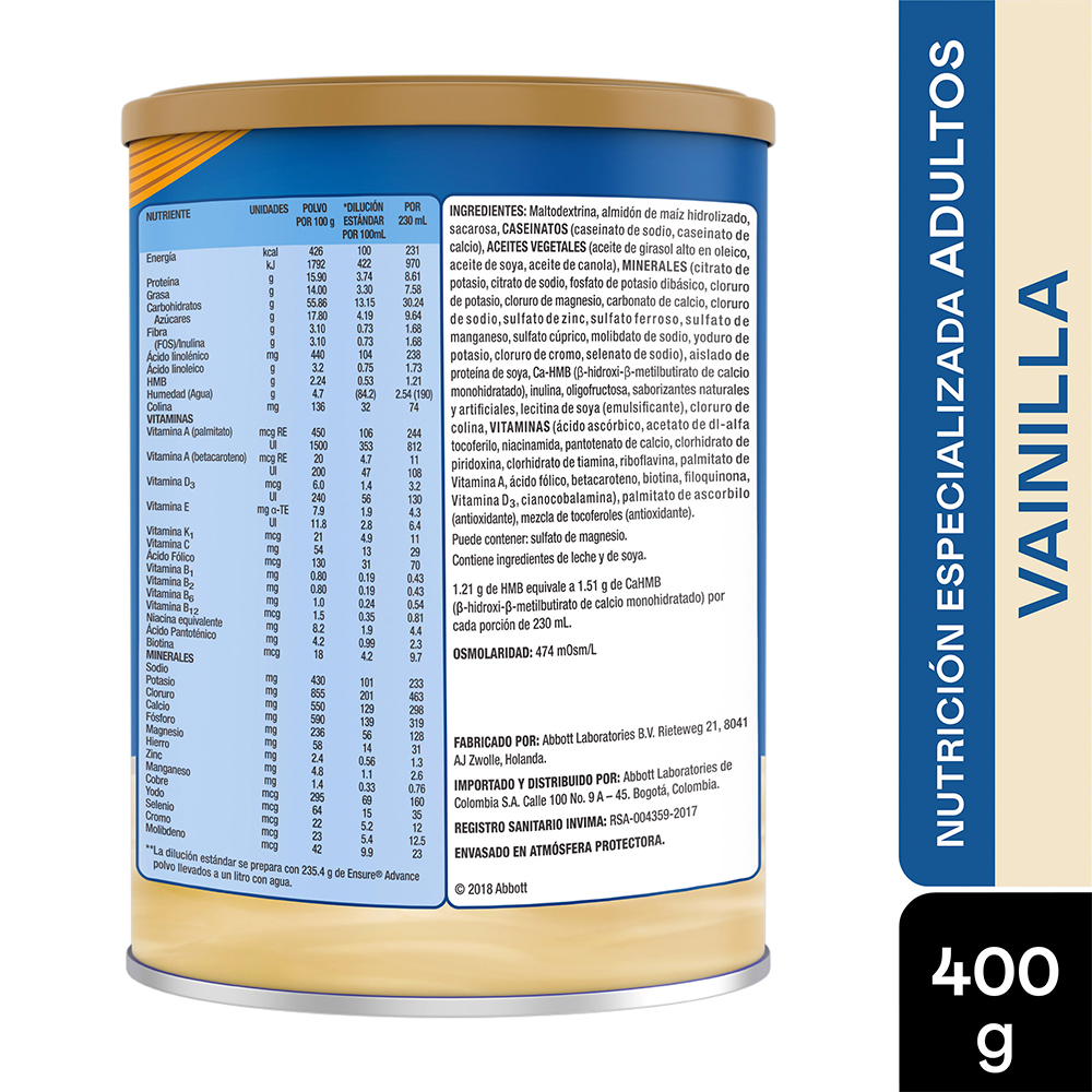 ENSURE ADVANCE VAINILLA TARRO X 400GR Nutrición Especializada. Contiene proteína, HMB, vitaminas y minerales
