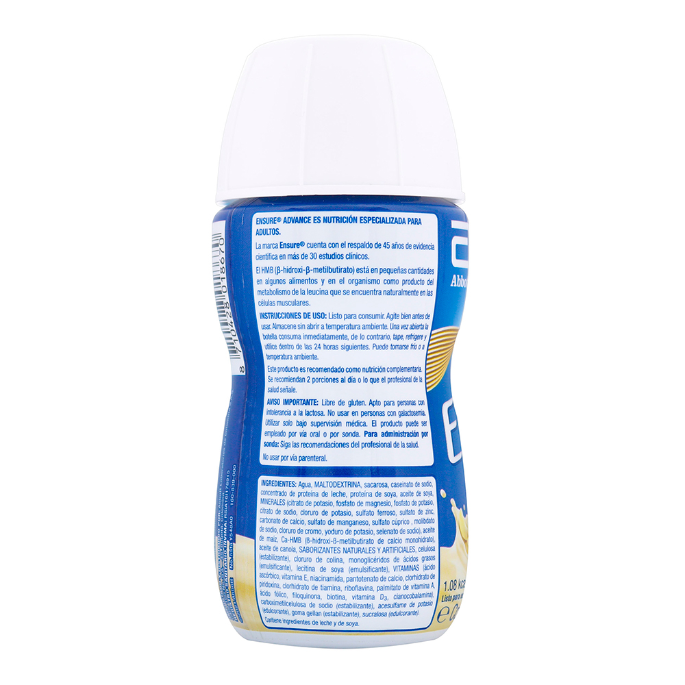 ENSURE ADVANCE es un suplemento nutricional líquido diseñado para proporcionar una nutrición completa y equilibrada. Viene en una botella de 220 ml con sabor a vainilla. Está especialmente formulado para ayudar a cubrir las necesidades nutricionales de personas que requieren un aporte extra de nutrientes, como aquellos que están convalecientes, tienen dificultades para alimentarse adecuadamente o necesitan una nutrición adicional debido a condiciones de salud específicas