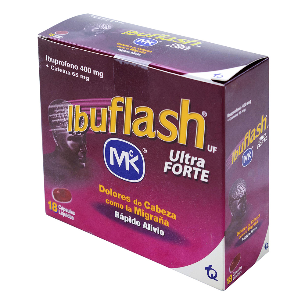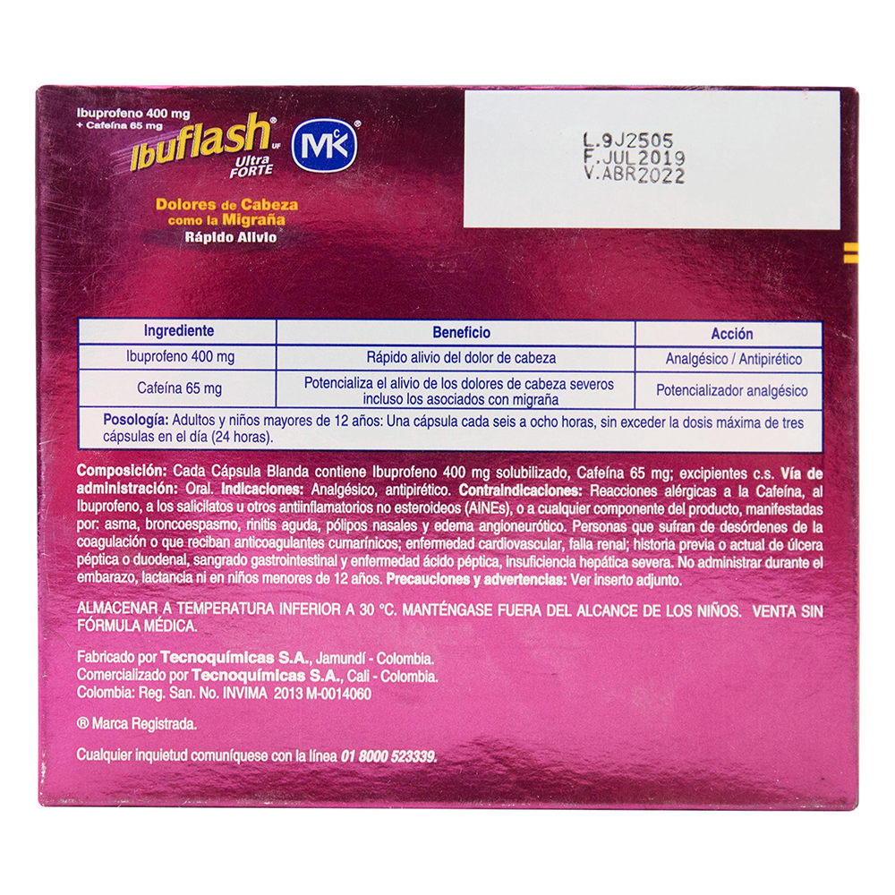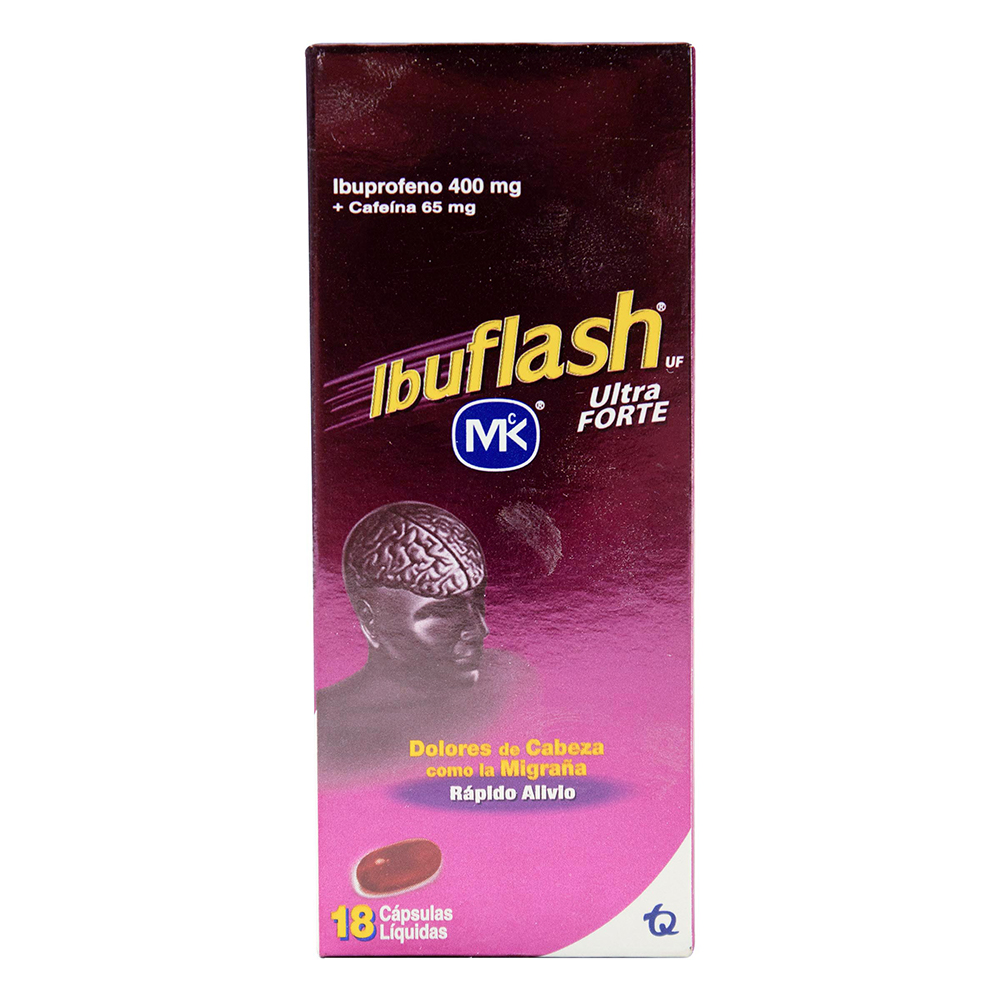 Indicaciones: Analgésico, antipirético. Posología: Adultos y niños mayores de 12 años: 1 cápsula blanda cada 6 a 8 horas sin exceder la dosis máxima permitida en un día (24 horas) de 3 cápsulas. Vía de administración: Oral. Contraindicaciones: Reacciones alérgicas a la Cafeína, al Ibuprofeno, a los salicilatos u otros antiinflamatorios no esteroideos (AINEs), o a cualquier componente del producto, manifestadas por: asma, broncoespasmo, rinitis aguda, pólipos nasales y edema angioneurótico. Personas que sufran de desórdenes de la coagulación o que reciban anticoagulantes cumarínicos; enfermedad cardiovascular, falla renal; historia previa o actual de úlcera péptica o duodenal, sangrado gastrointestinal y enfermedad ácido péptica, insuficiencia hepática severa. No administrar durante el embarazo, lactancia ni en niños menores de 12 años