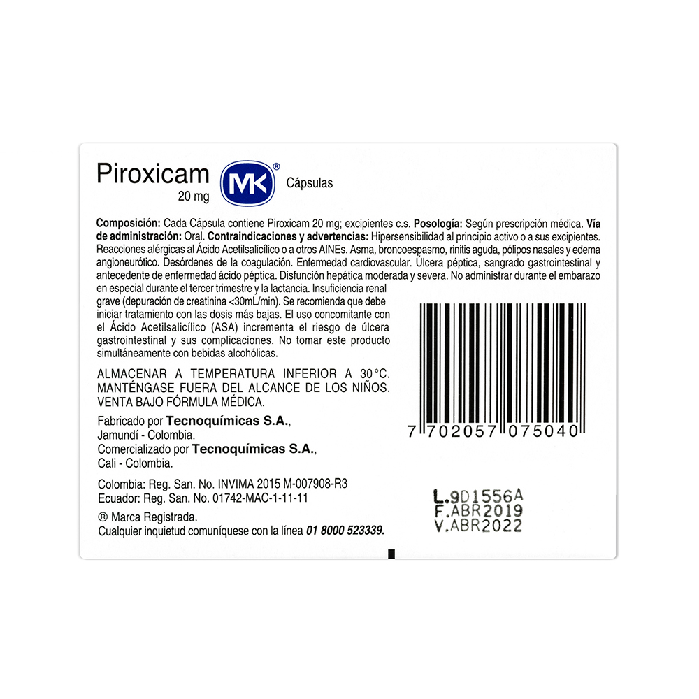 Piroxicam Mk 20mg Cápsula Caja X10cáp.