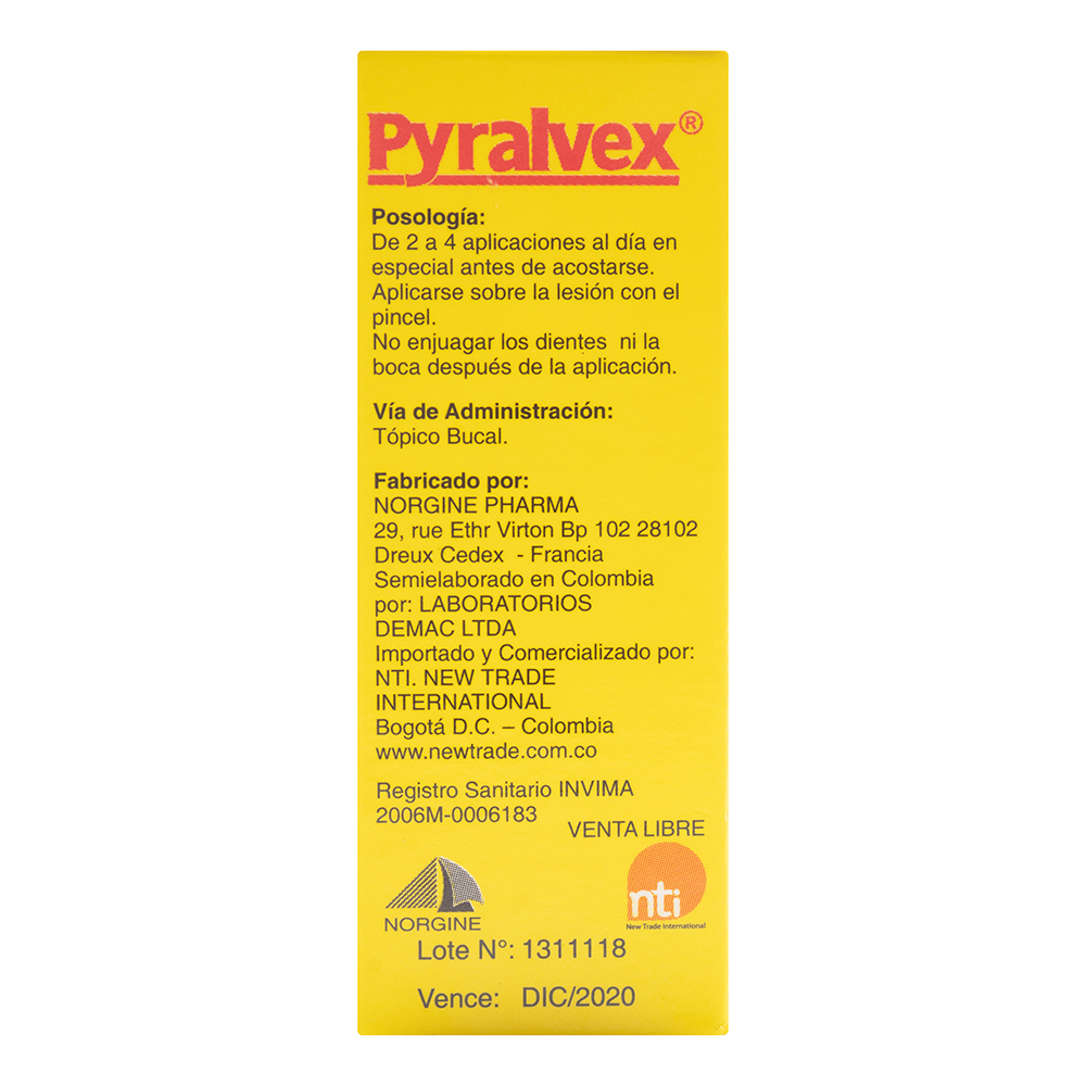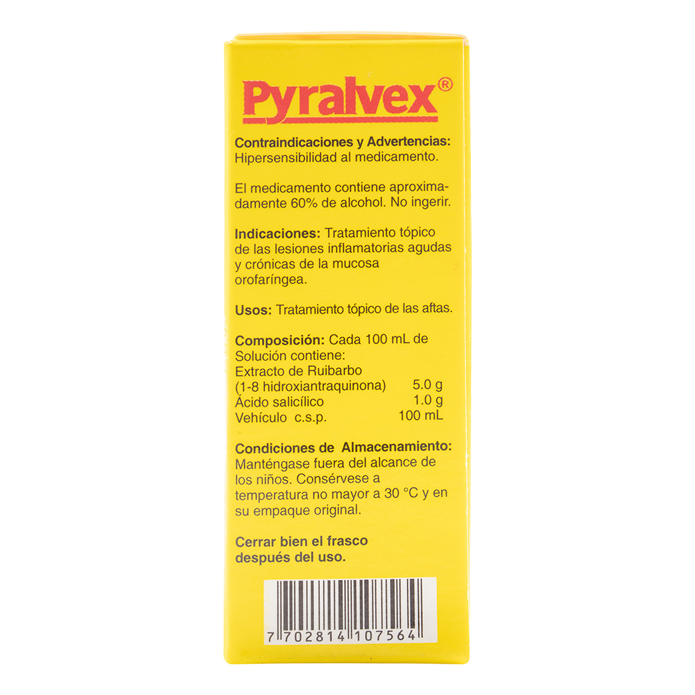 Pyralvex Solución Tópica 10 Ml es una solución tópica de uso bucofaríngeo para tratar la inflamación y las pequeñas lesiones bucales como aftas y alteraciones de la mucosa bucal relacionadas con el uso de aparatos ortopédicos, dentaduras postizas, etc..
