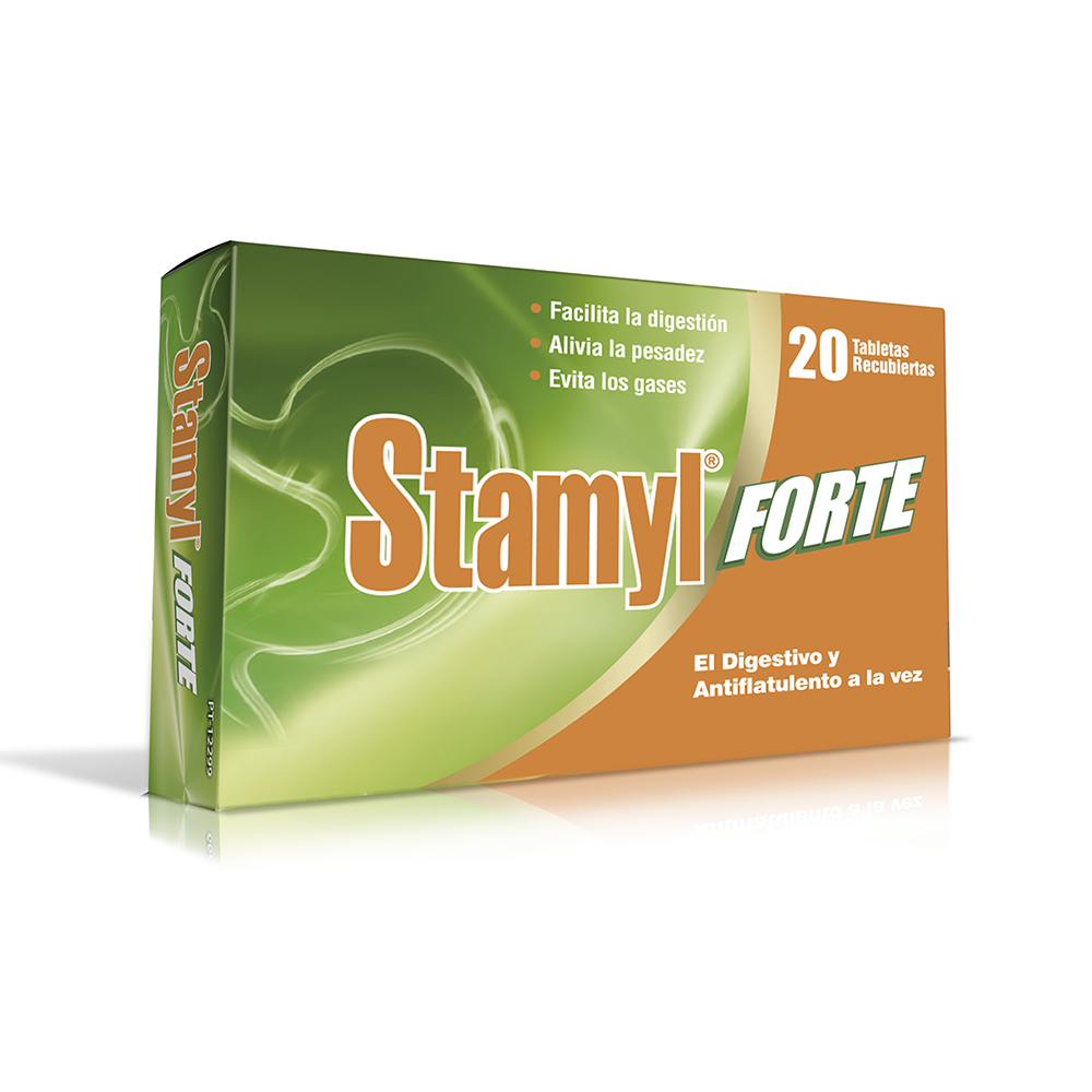 Stamyl forte es una combinación de enzimas digestivas (pancreatina) con simeticona, que contribuye a mejorar los síntomas dispépticos, o de mala digestión y a facilitar la expulsión de gases acumulados en el tubo digestivo