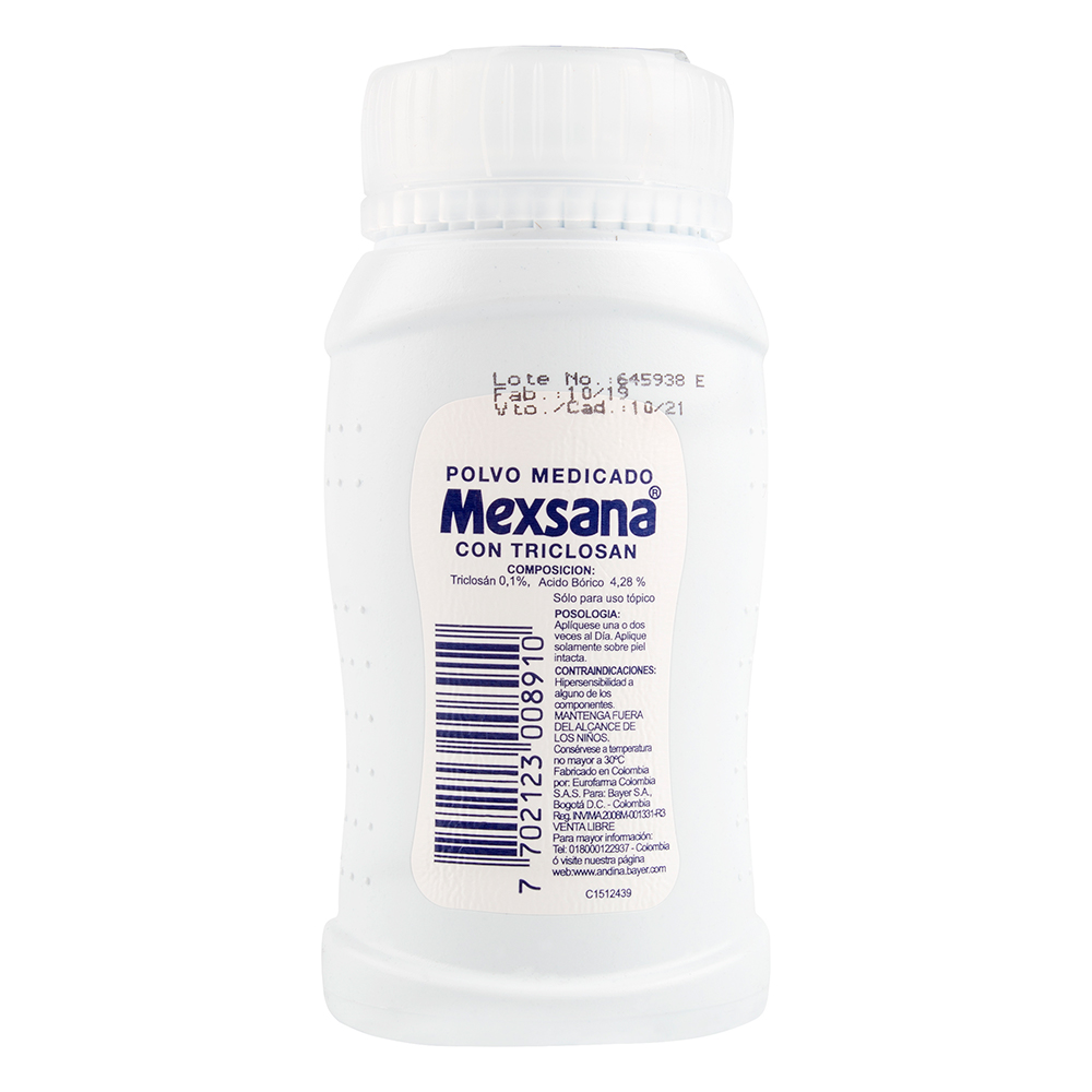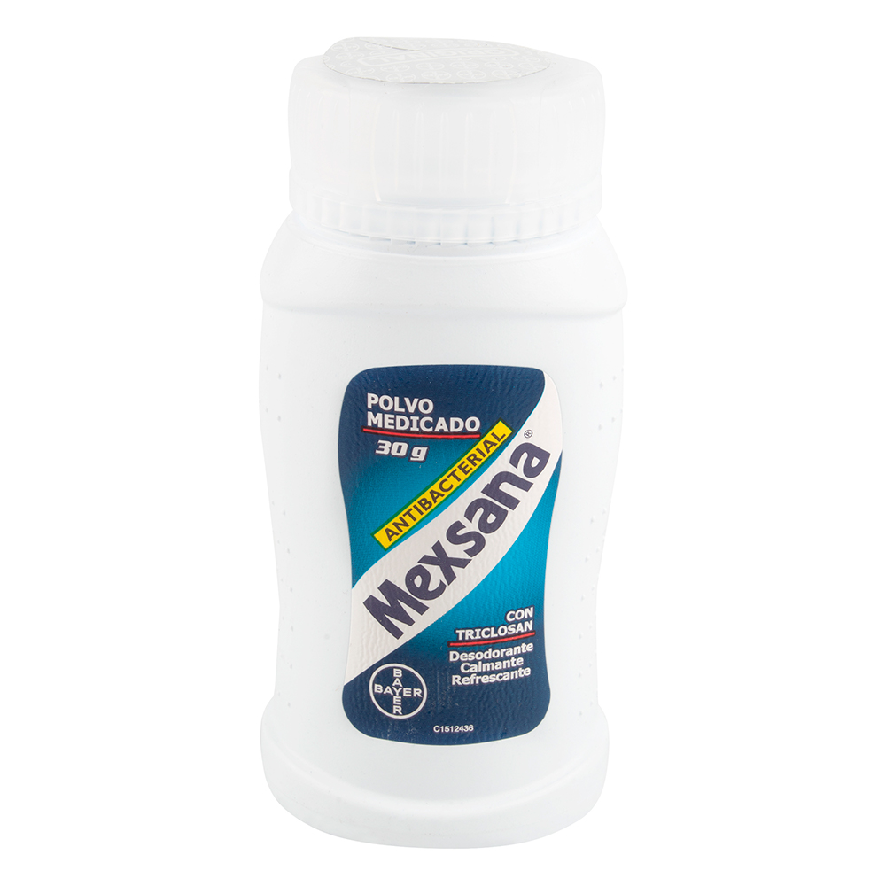 Talco Mexsana 30 gramos. Polvo medicado con triclosán. Desodorante, calmante y refrescante. Consérvese a temperatura no mayor a 30ºC. Mantenga fuera del alcance de los niños.