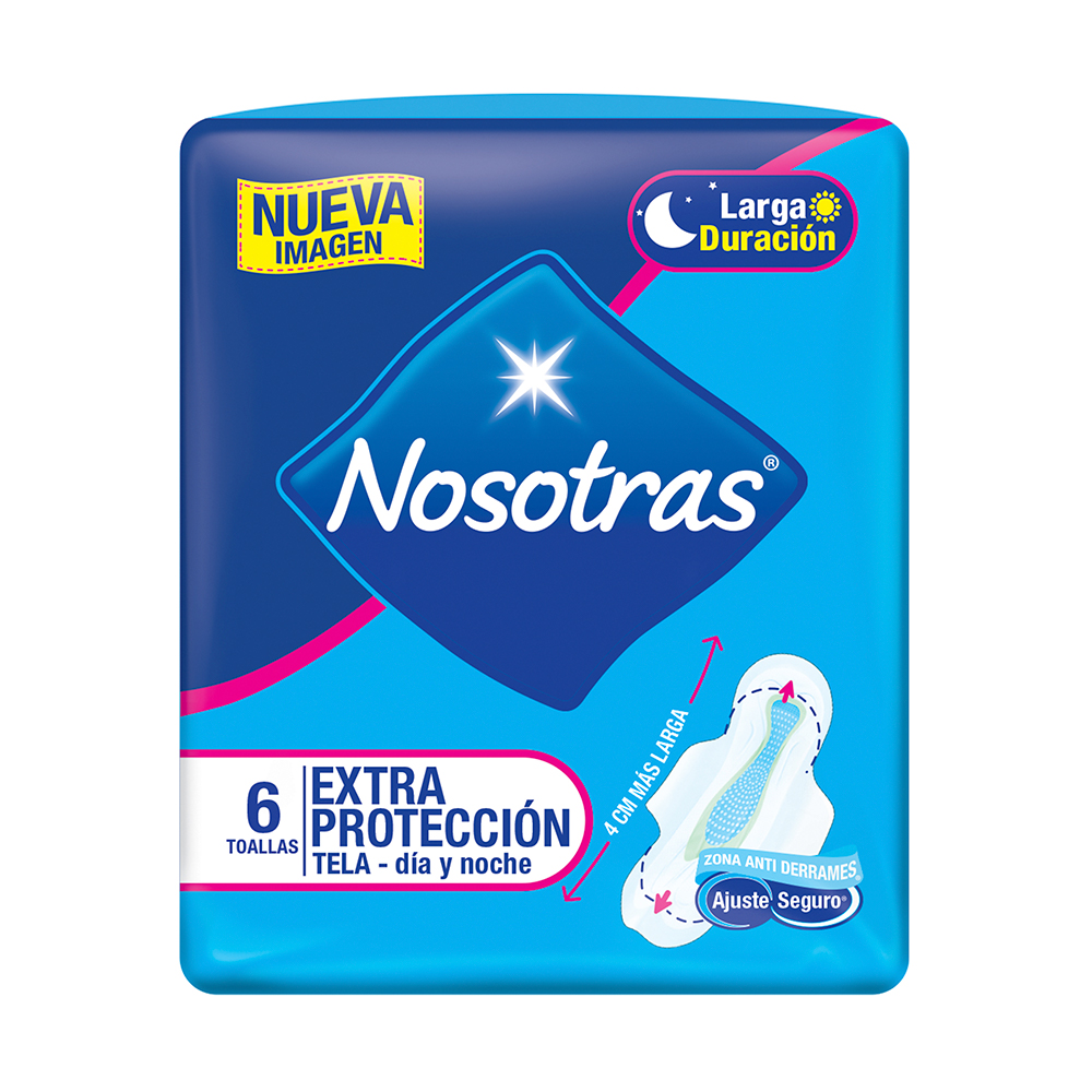 A ti que te gusta sentirte protegida por más tiempo, las Nosotras Extra Protección Tela, son 4 centímetros más largas que una toalla normal, ideales para flujo abundante, perfectas para usarlas de día y de noche.